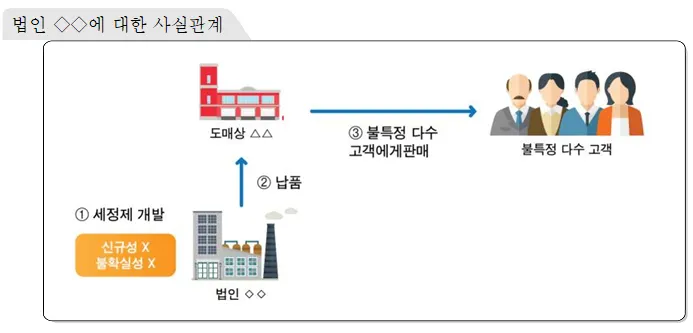 • 법인 ◇◇는 ○○세정제를 개발하여 도매상 법인 △△를 통해 불특정 소비자에게 판매하였고, 개발한 세정제 구성은 선행특허와 유사도가 높고 연구자료를 통해 개발과정이 소명되지 않았음
