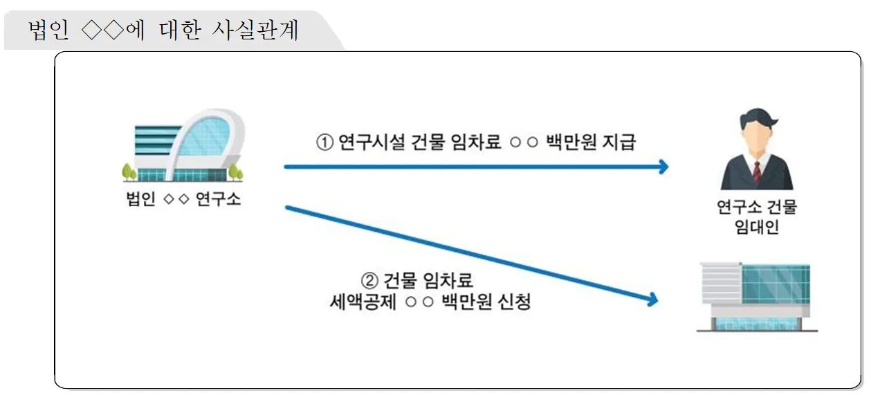 • 법인 ◇◇는 자동차 제어장치를 제조하는 법인으로 연구실 시험과정에서 사용하는 시제품 제작에 사용되는 부품 외에 연구시설 건물의 임차료 ○○백만원을 재료비로 분류하여 연구・인력개발비 세액공제 신청