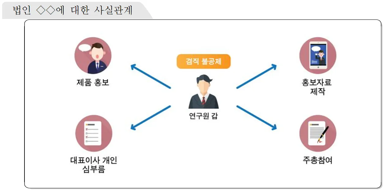 • 연구원 갑은 법인◇◇의 등기 이사이자 대표이사의 배우자로서 전국 각지에서 관련 강연 및 제품 홍보를 수십 회 실시하고대표이사 개인 심부름, 홈페이지 홍보자료 제작, 전단지 제작 등 수행