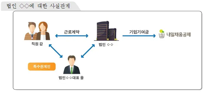• 직원 갑은 실제 회사에서 근무하고 내일채움공제 또한 납입하였음이 확인되나 해당 법인의 최대주주인 법인대표 을과 특수관계이므로 갑에 대한 내일채움공제 기업 기여금 납입액은 인력개발비로 불인정