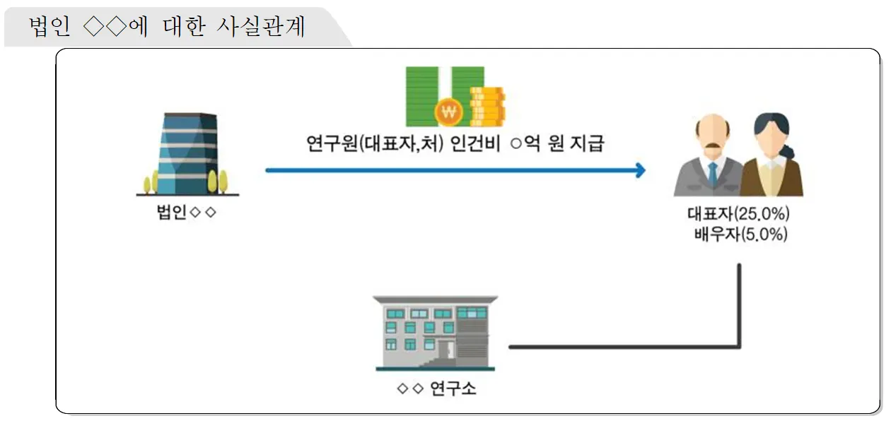 법인 ◇◇는 전담연구원 2명이 부부이며, 남편은 당 법인의 보유주식 10%를 초과하는 대표이사이고 처는 주식 5% 보유하고 있는 등기 이사임